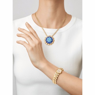描述 Bouton d’or®系列的灵感源自Paillette图案的弧形线条,此珠宝设计源自Van Cleef * Arpels梵克雅宝于1930年代末的创作。如今,世家重新演绎此设计,以不同的组合和色彩创作风格柔美的项链、戒指、手链及耳环。 Bouton d’or吊坠,黄K金,青金石,绿松石,圆形钻石;DEF、IF至VV*w*S级钻石。 作品编号 : VC*w*ARP1BF00   详情 宝石 绿松石 : 8 宝石 钻石 : 30 宝石, 0.94 克拉