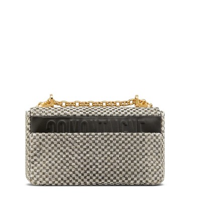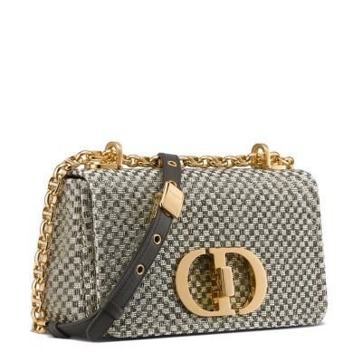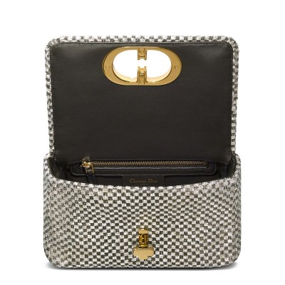 Dior Caro 手袋融合了现代感和永恒的优雅。这款小号灰色小牛皮饰有珍珠刺绣,呈现出棋盘格效果。这款包的翻盖上点缀着复古金色金属的扭曲 CD 扣环,灵感来自 Christian Dior 香水瓶。带有 CD 标志链节的可拆卸链条肩带可以手提、肩背或斜挎,也可以换成一条来自 Maison 的宽刺绣肩带,白天和晚上都可以佩戴。